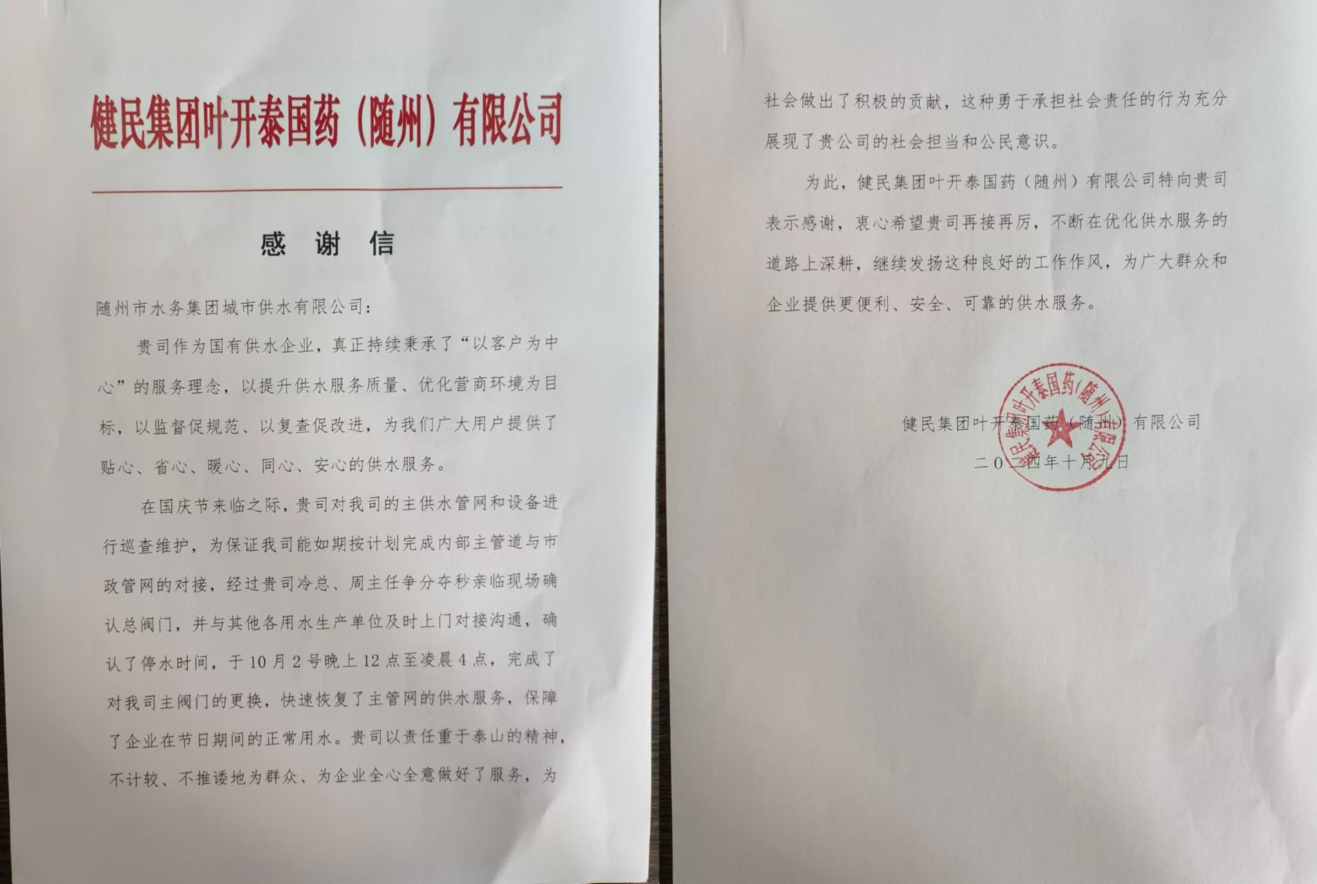 健民集團葉開泰國藥(隨州)有限公司負責人表示:“非常感謝供水公司人員的熱情服務(wù),及時為企業(yè)排憂解難,保障企業(yè)生產(chǎn)用水需求,真正為企業(yè)辦好事辦實事。這種勇于承擔社會責任的行為充分展現(xiàn)了隨州水務(wù)的社會擔當和公民意識?!?/span>