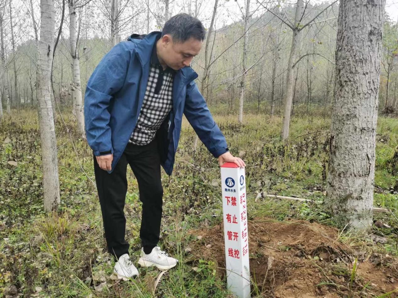 在施工現(xiàn)場,工作人員正緊鑼密鼓地進行標(biāo)志樁的挖坑、埋設(shè)與澆筑作業(yè),完成的幾處標(biāo)志樁連成一條直線,將地下管道位置清晰地“反射”到地面,為供水管道賦予了明確的身份標(biāo)識。這些新標(biāo)志樁的設(shè)計獨具匠心,樁身上鐫刻有“下有管線 禁止開挖”“隨州水務(wù)”“熱線電話0722-3318118”等字樣,既直觀又醒目。市民們看到標(biāo)志樁后一目了然地下管線的埋設(shè)情況,同時熱線電話可以讓每個市民都參與到供水管線的保護中來,共同守護供水管線安全。
