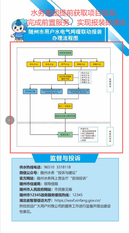 1.“零環(huán)節(jié)”:客戶需要用水時,即時通水; 2.“零跑腿”:安排“客服專員”全程上門服務,無需客戶跑腿; 3.“零資料”:通過湖北省工程建設審批系統(tǒng)、湖北省政務服務平臺獲取項目信息,無需客戶提報資料; 4.“零費用”:針對企業(yè)用戶供水接入項目,工程設計、材料、監(jiān)理、施工全部免費。 |