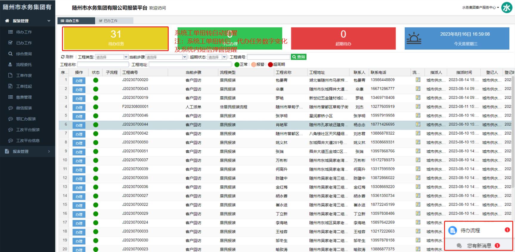 4)報裝業(yè)務(wù)系統(tǒng)自動流轉(zhuǎn)提醒,功能界面截圖