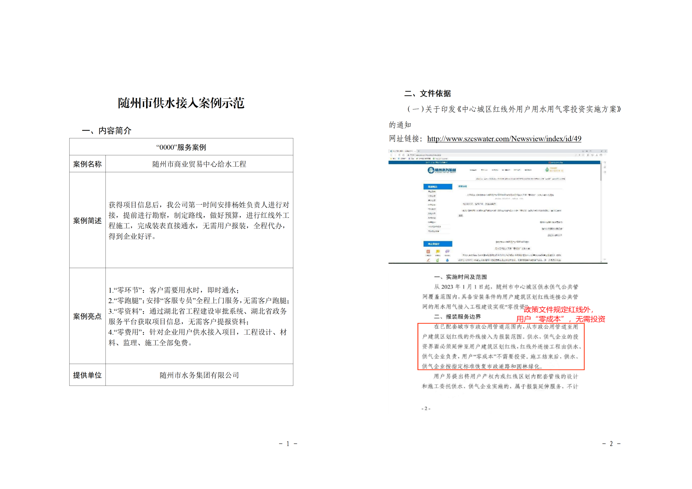 隨州市水務(wù)集團(tuán)主要職責(zé)是向隨州市中心城區(qū)、曾都區(qū)、隨縣以及高新區(qū)提供供水服務(wù),集團(tuán)公司下轄城市供水公司、建設(shè)工程公司、水質(zhì)檢測公司、隨縣供水公司、康潤實(shí)業(yè)公司5家全資子公司。下面展示隨州市中心城區(qū)供水接入案例示范。
